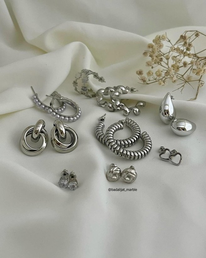 پکگوشواره اقتصادی رنگ نقره ای پک شامل ۹جفت گوشواره میباشد جنس رادیوم هست و ابکاری خوبی داره مراقبتی میباشد