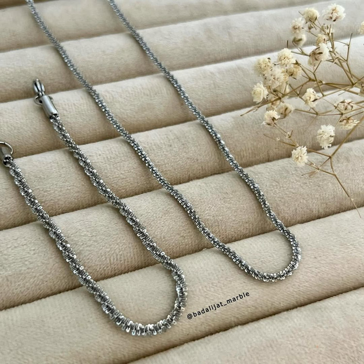 زنجیر خاویاری شامل گردنبند و دستبند رنگ نقره ای رنگ ثابت میتونید هم به صورت ست و هم تکی سفارش بدید