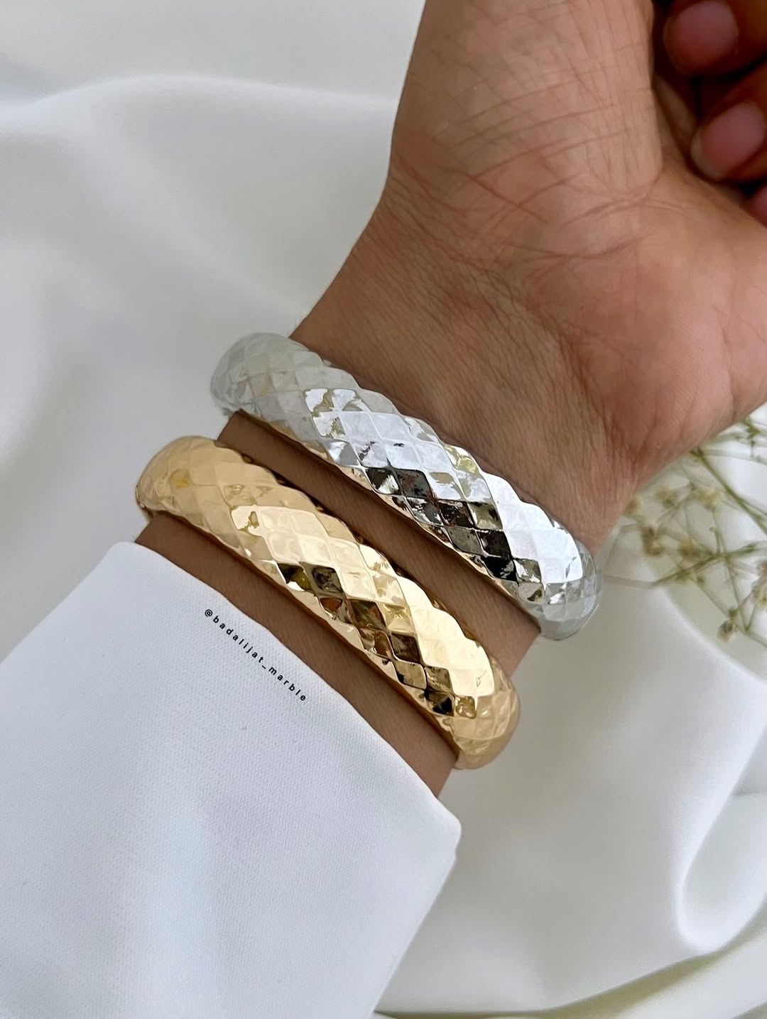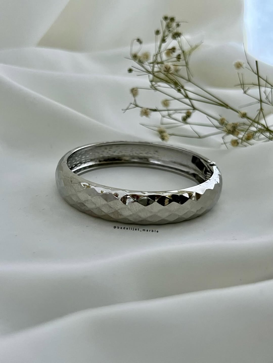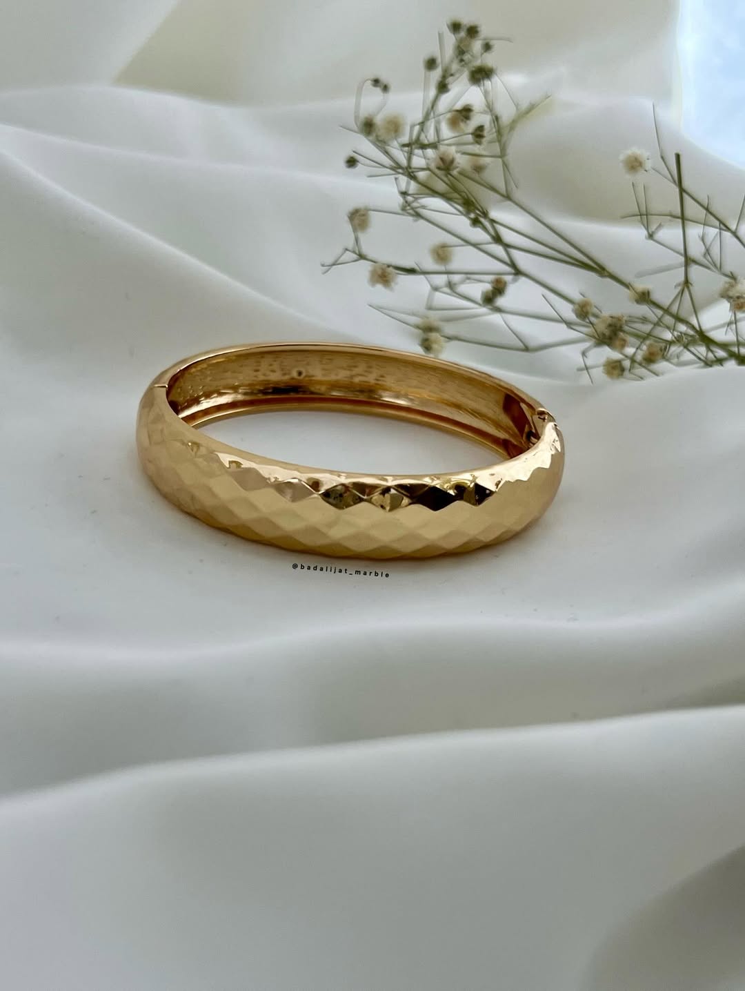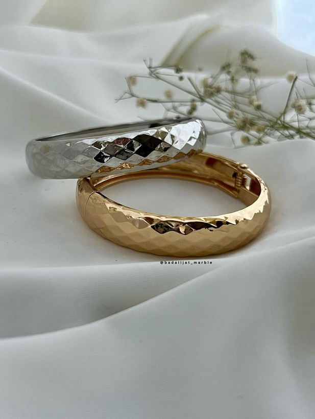 بنگل النگویی یه کار شیک و خوش دست مشابه طلا در دو رنگطلایی و نقره ای به راحتی باز و بسته میشه استیل نیست ولی کیفیت آبکاریش بالاست مراقبتی میباشد مناسب تا مچ۱۸سانت