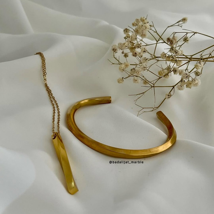 ست پر طرفدارپیچ شامل بنگل و دستبند از جنس برنج با رنگ ثابت رنگ طلایی. طول زنجیر ۴۵ سانت بنگل فری سایز.