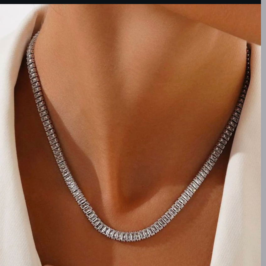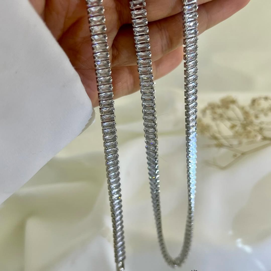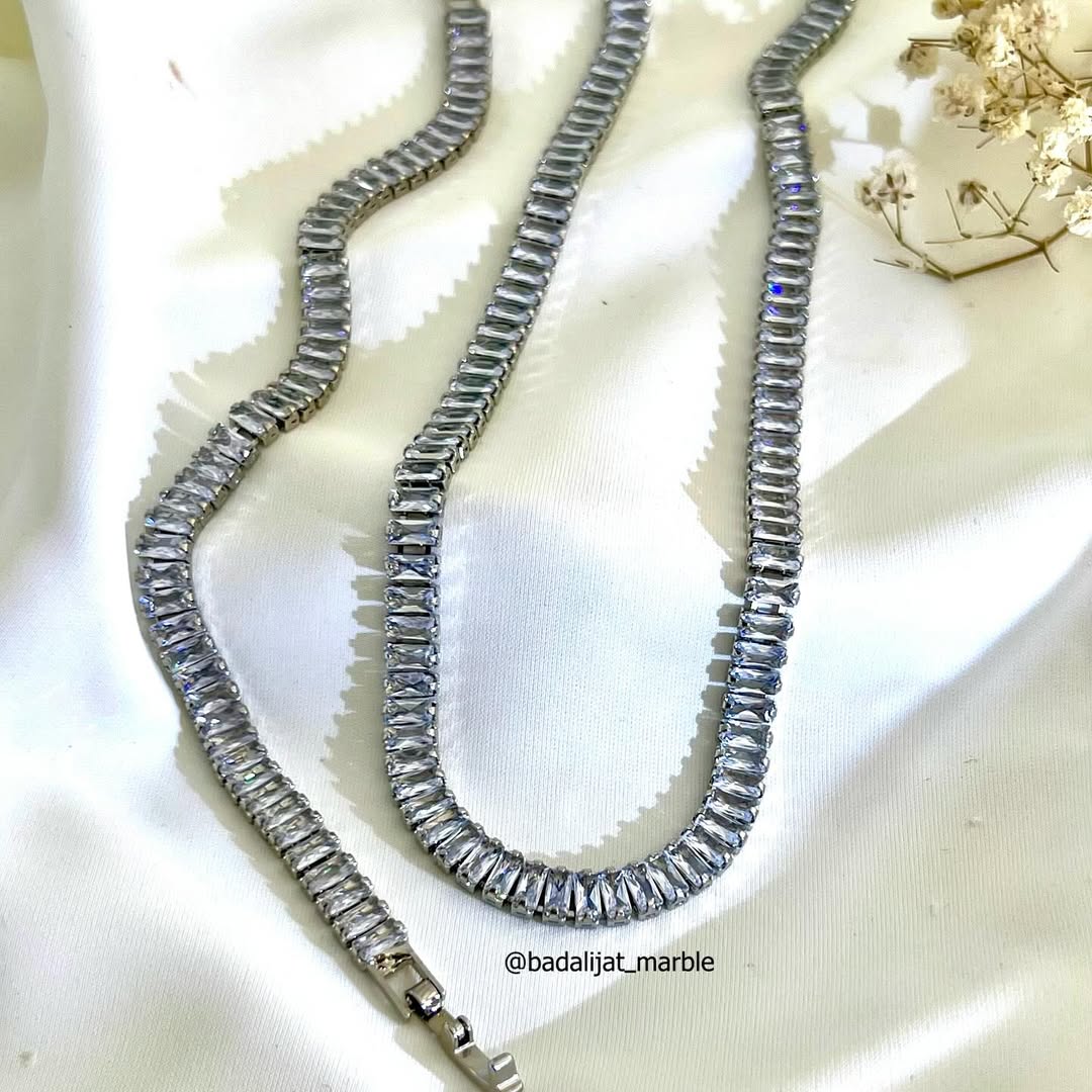 ست گردنبند و دستبند تنیسی رنگ نقره ای یه کار خاص و چشمگیر رنگثابت ولی مراقبتی میباشد به خاطر نگینایی که داره
