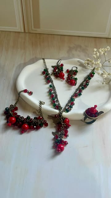 ست یلدایی شامل گردنبند و گوشواره و دستبند وانگشتر ساخته شده از سنگ کریستال و زنجیر برنج وخرج کار انار یه کار دست ساز