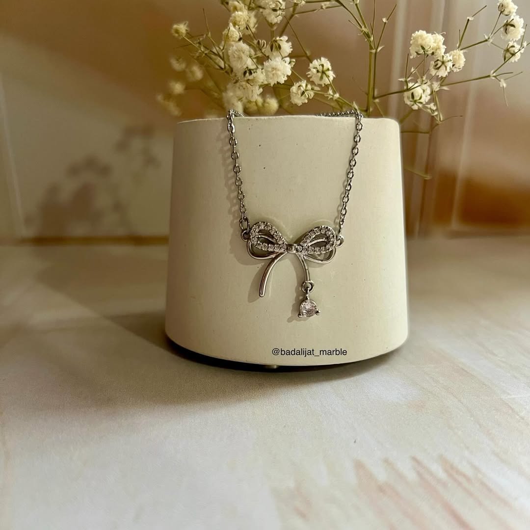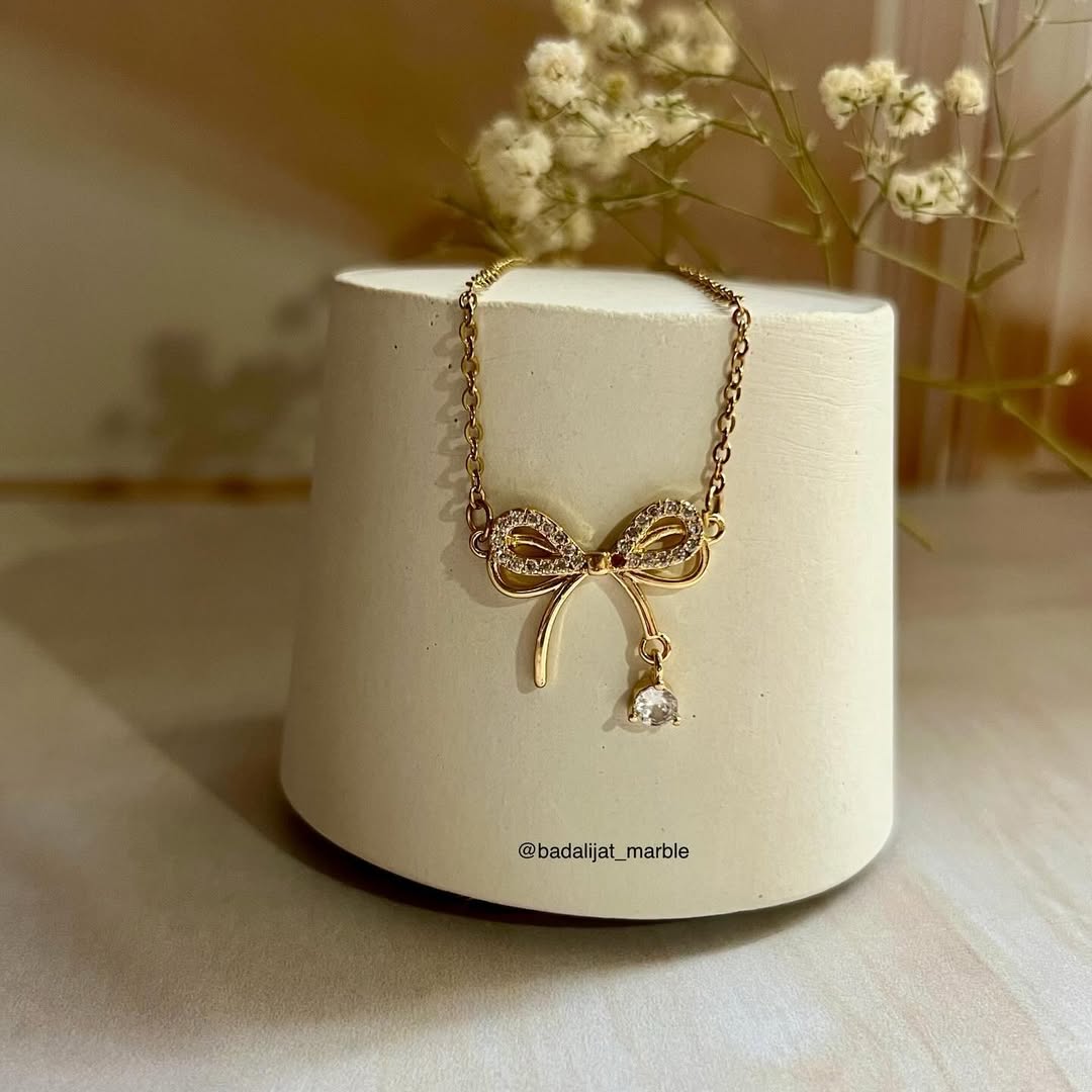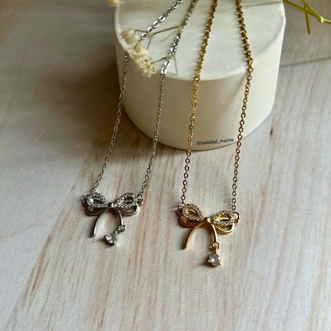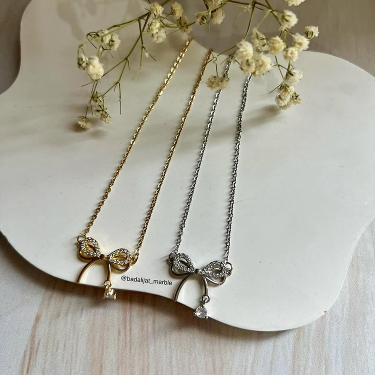 این گردنبند یکی از قشنگترینه گردنبند پاپیون در دو رنگ طلایی و نقره ای جنس پلاک سوارسکی و نیاز به مراقبت داره زنجیر استیل.