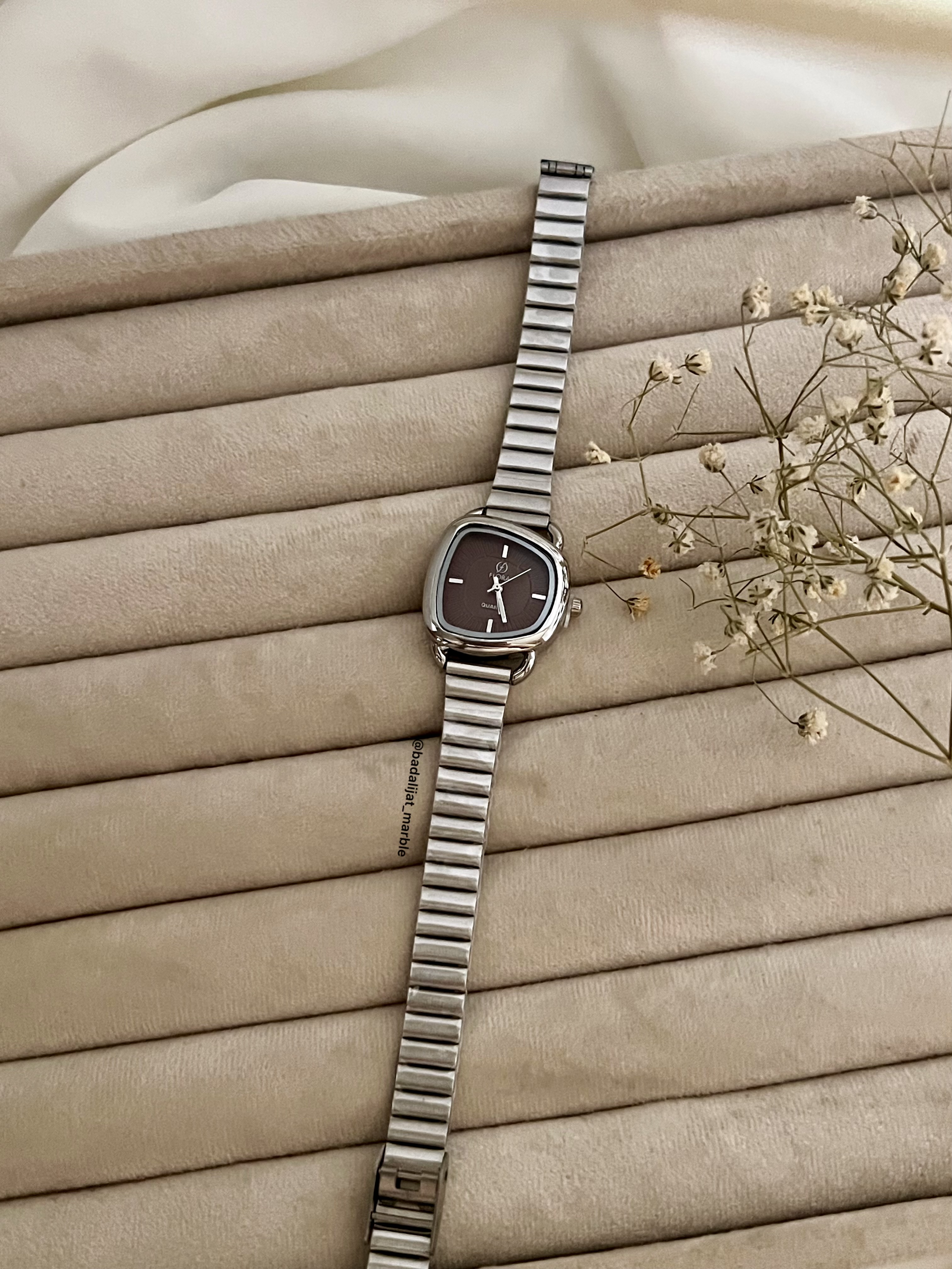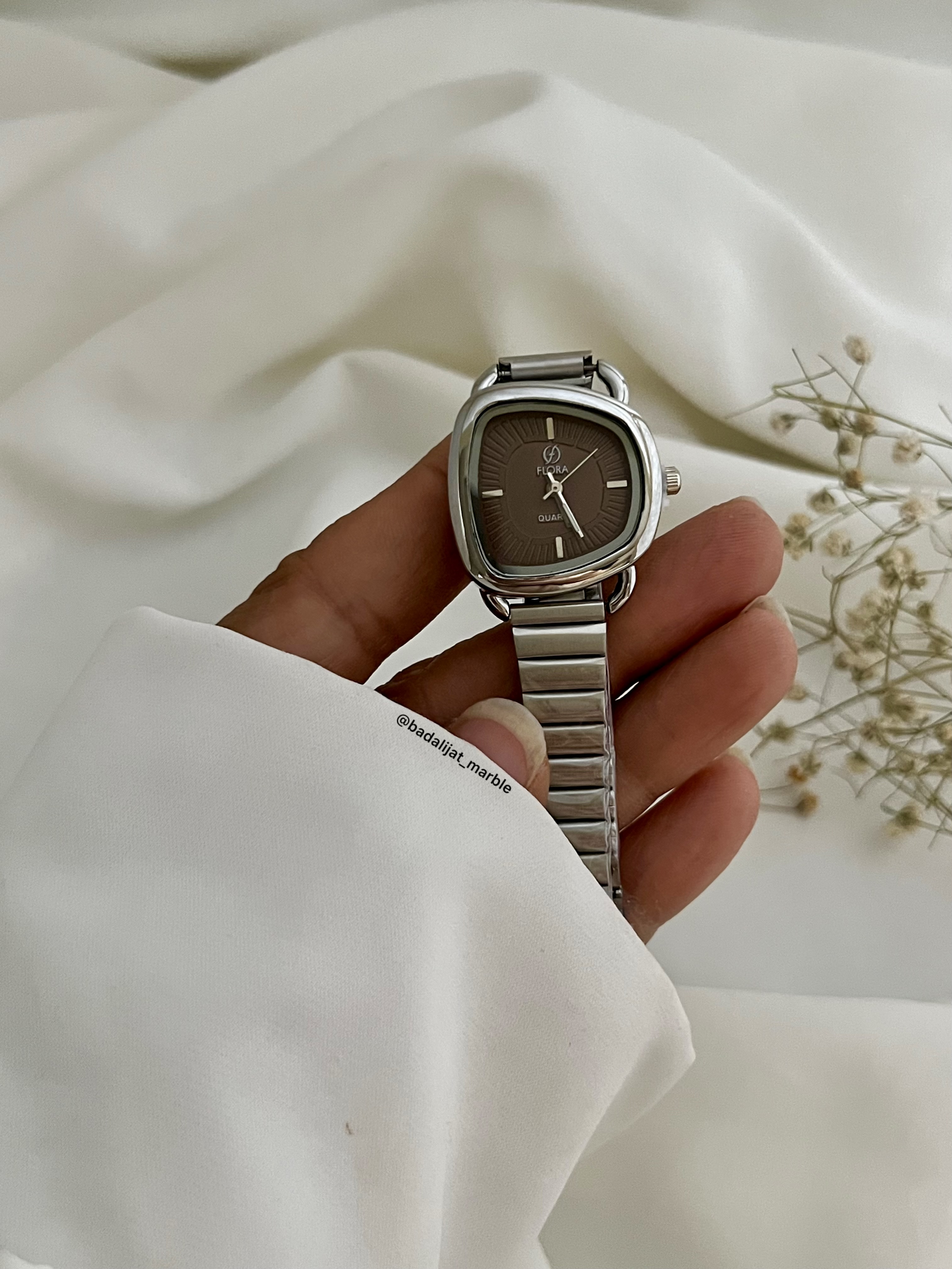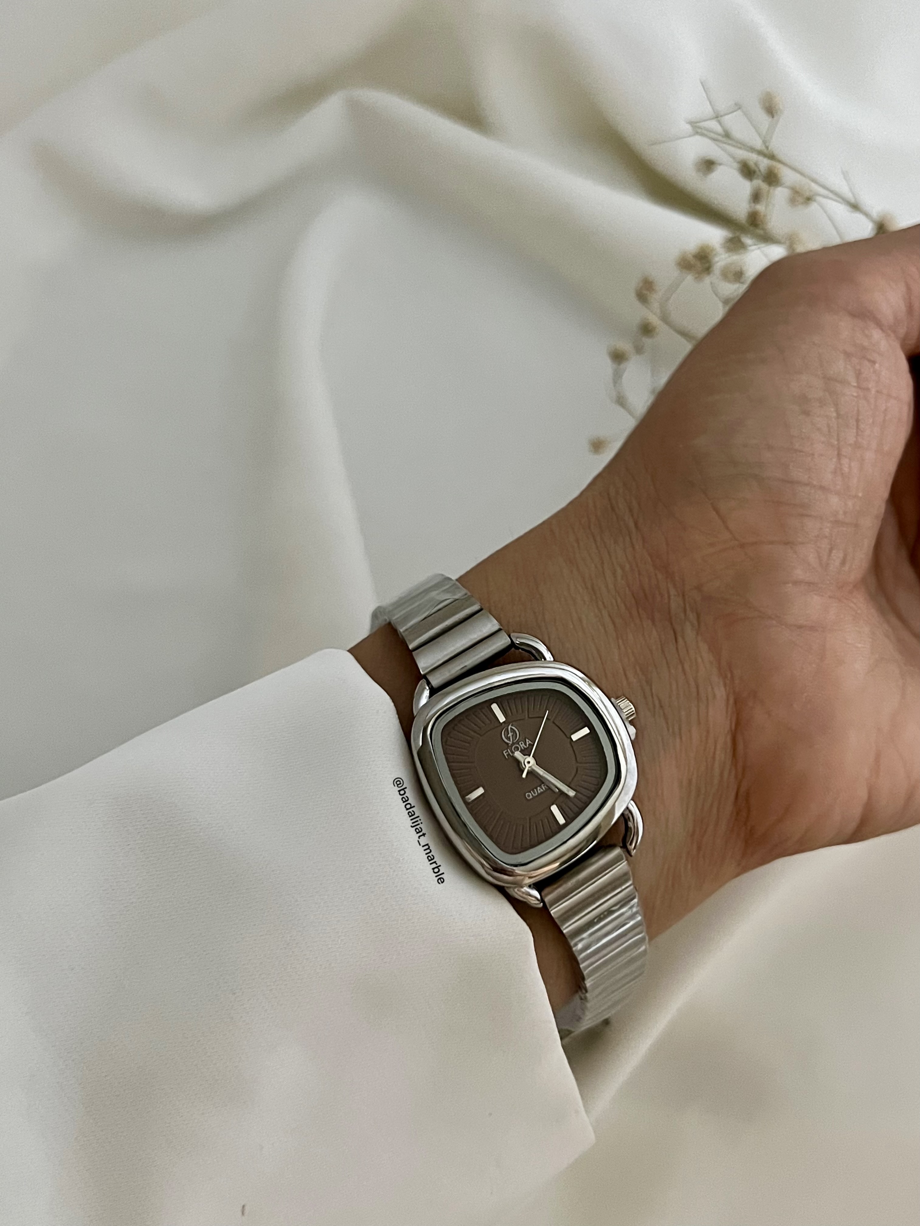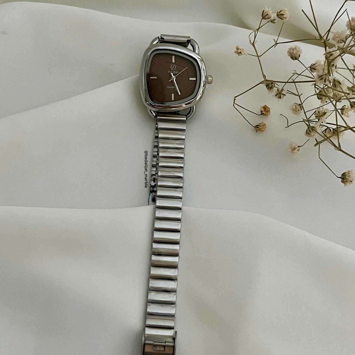 ساعت دفرمه جذاب ترند پاییز برند فلورا رنگ پر طرفدار شکلاتی بند نقره ای رنگ ثابت بند قابل تنظیم
