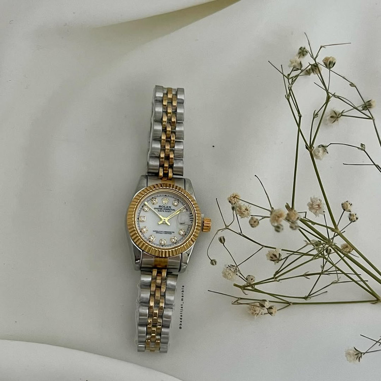 ساعت رولکس با کیفیت زنانه رنگبند ثابت ودور قاب مراقبتی باتری قابل تعویض تاریخ دار ترکیب رنگ نقره ای وطلایی