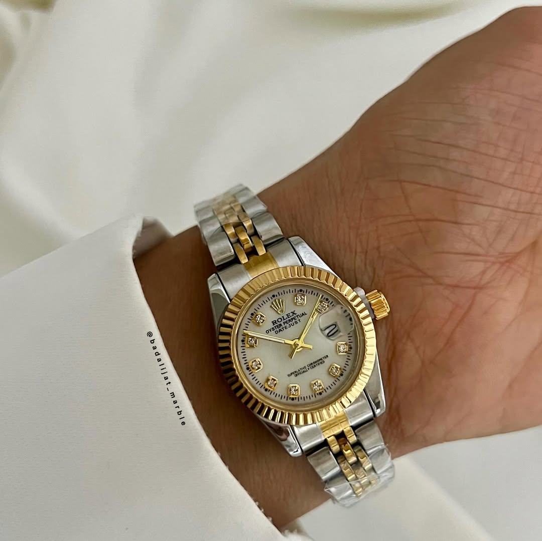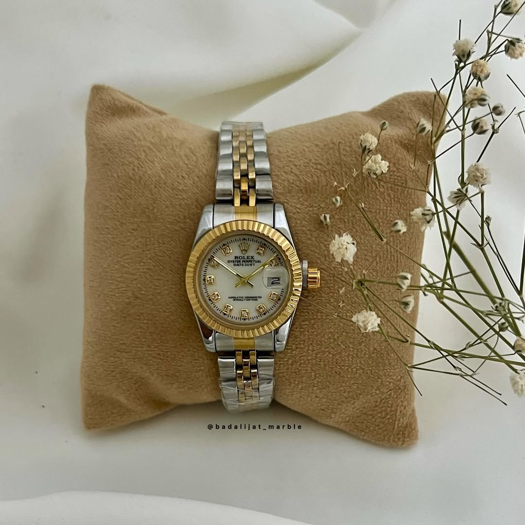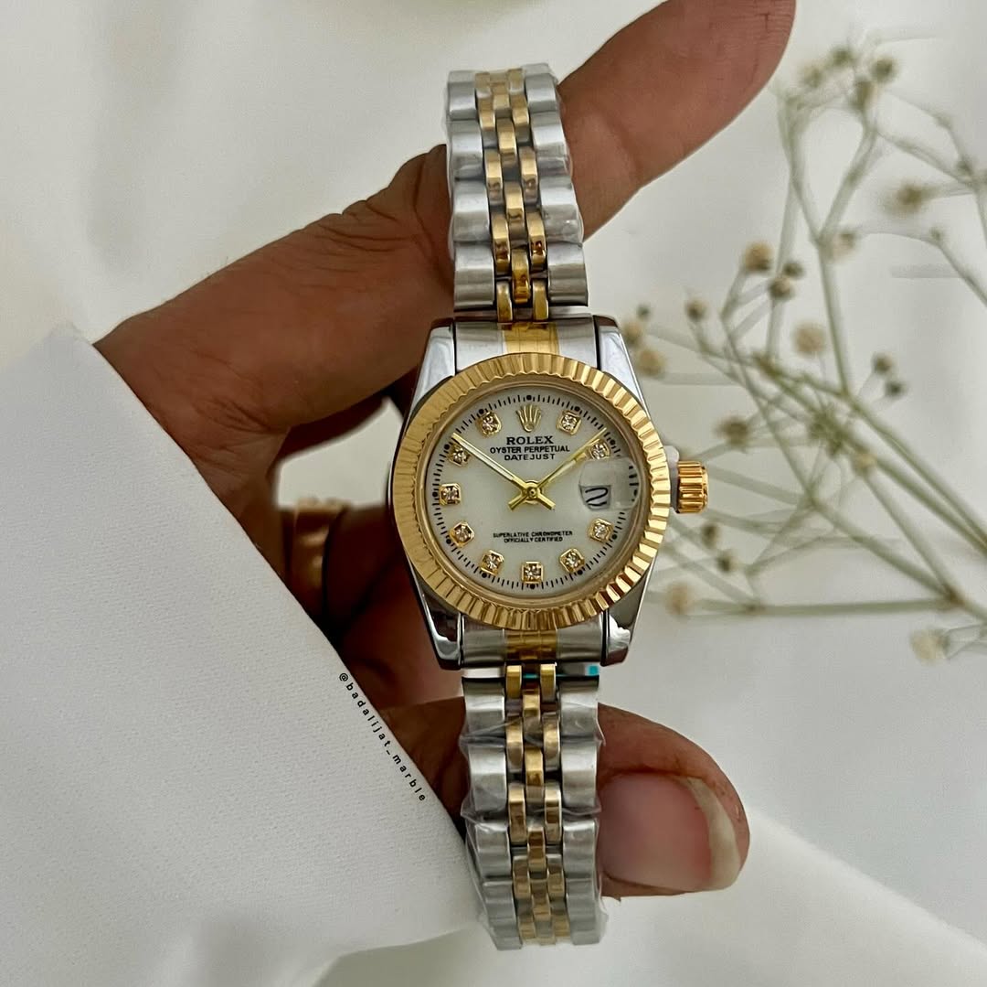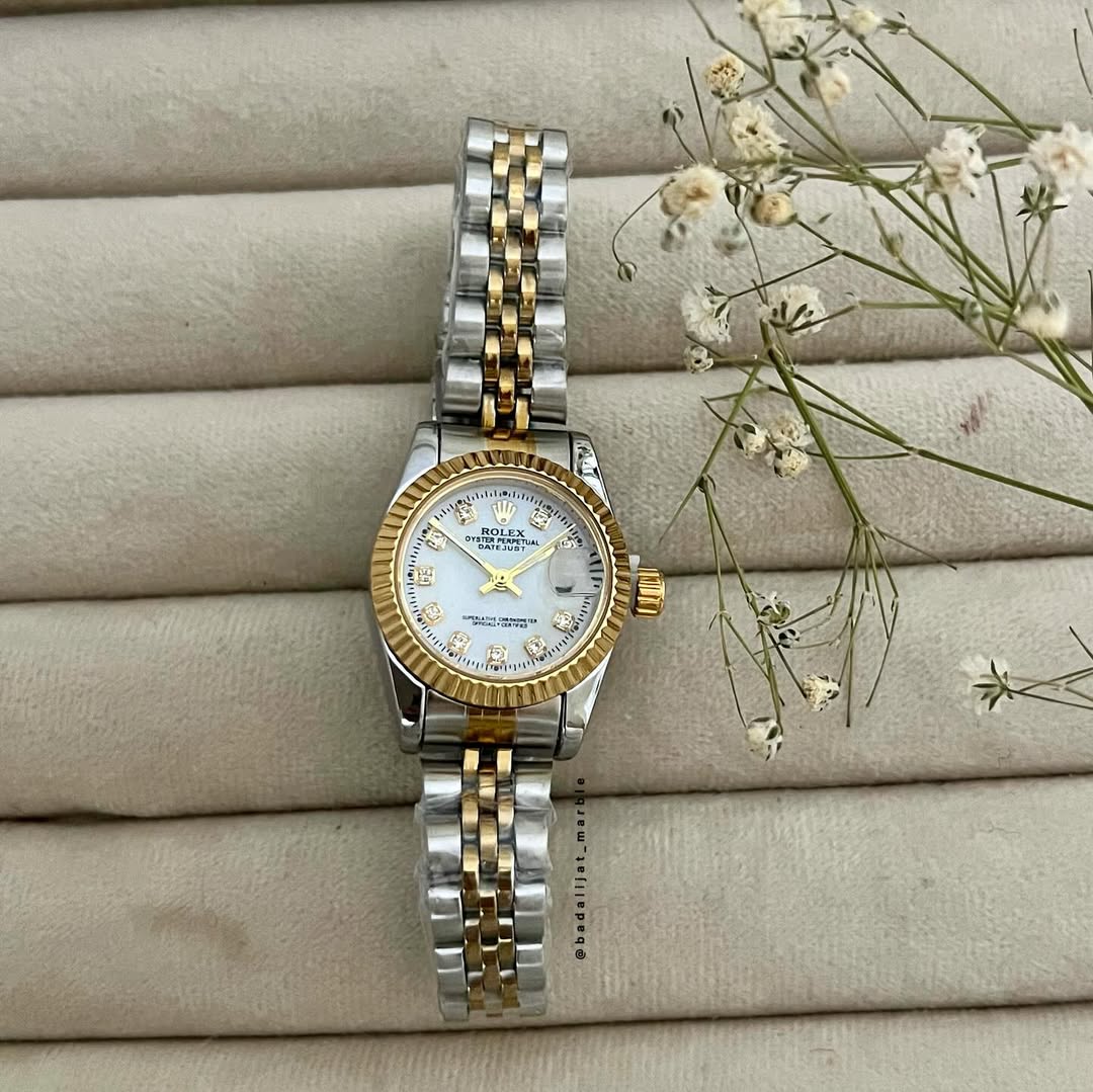 ساعت رولکس با کیفیت زنانه رنگبند ثابت ودور قاب مراقبتی باتری قابل تعویض تاریخ دار ترکیب رنگ نقره ای وطلایی