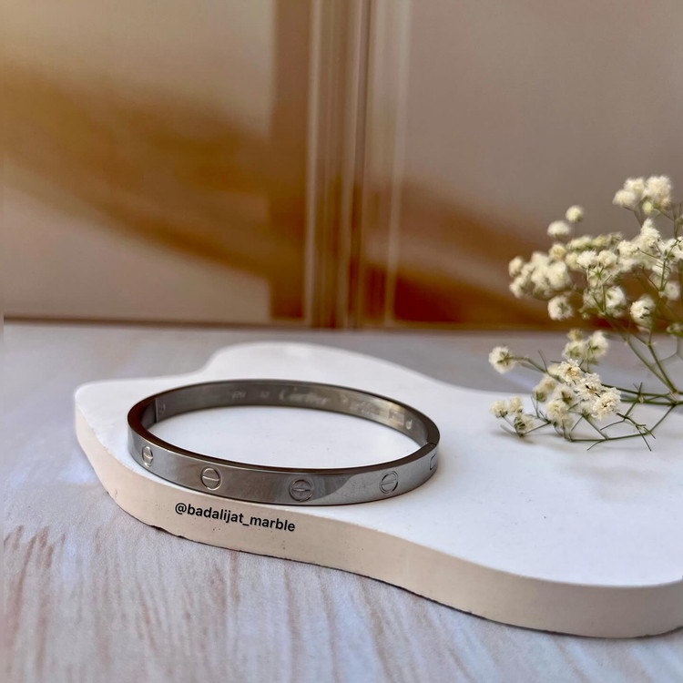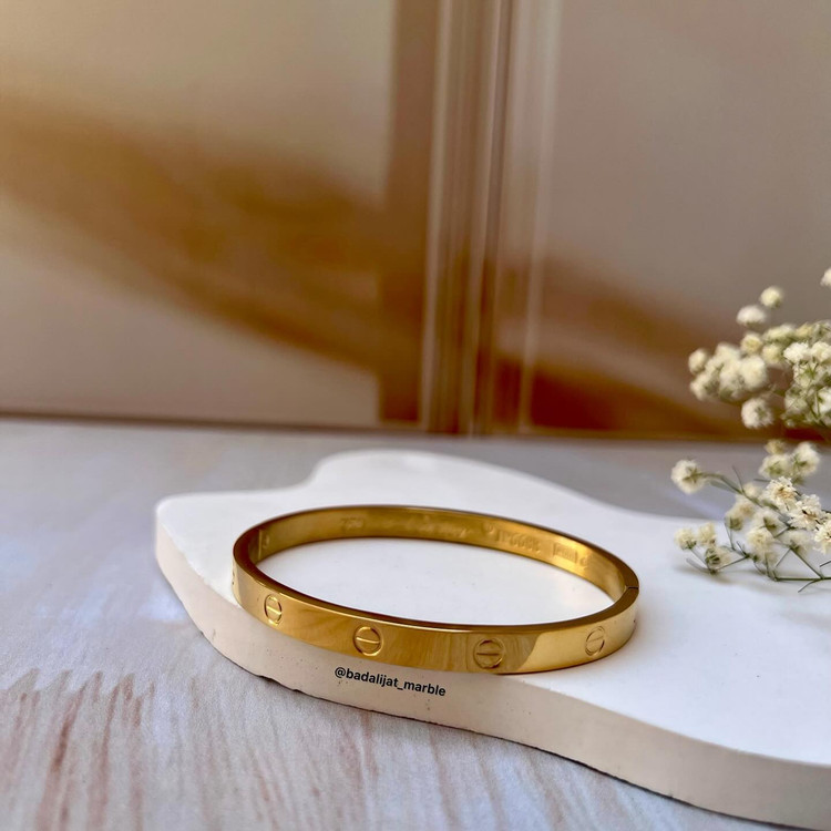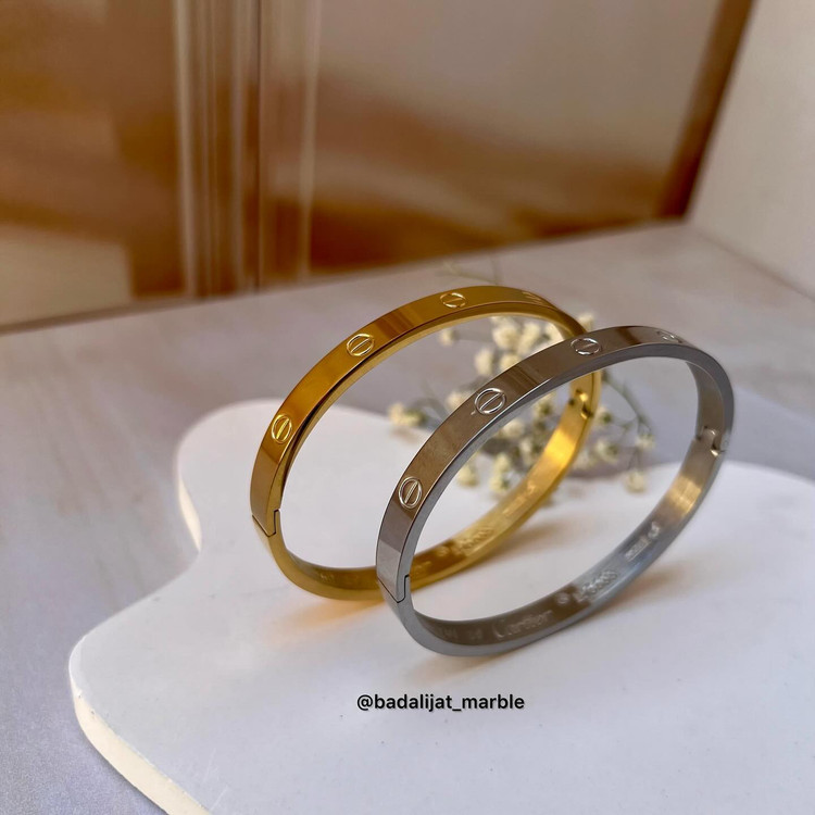 دستبند کارتیر یکی از پرفروش ترین هست و میتونم بگم مرگ نداره از بس با کیفیته در دو رنگ طلایی و نقره ای با ضخامت ۸میل استیل رنگ ثابت تا دور مچ۱۸سانت ساپورت میکنه